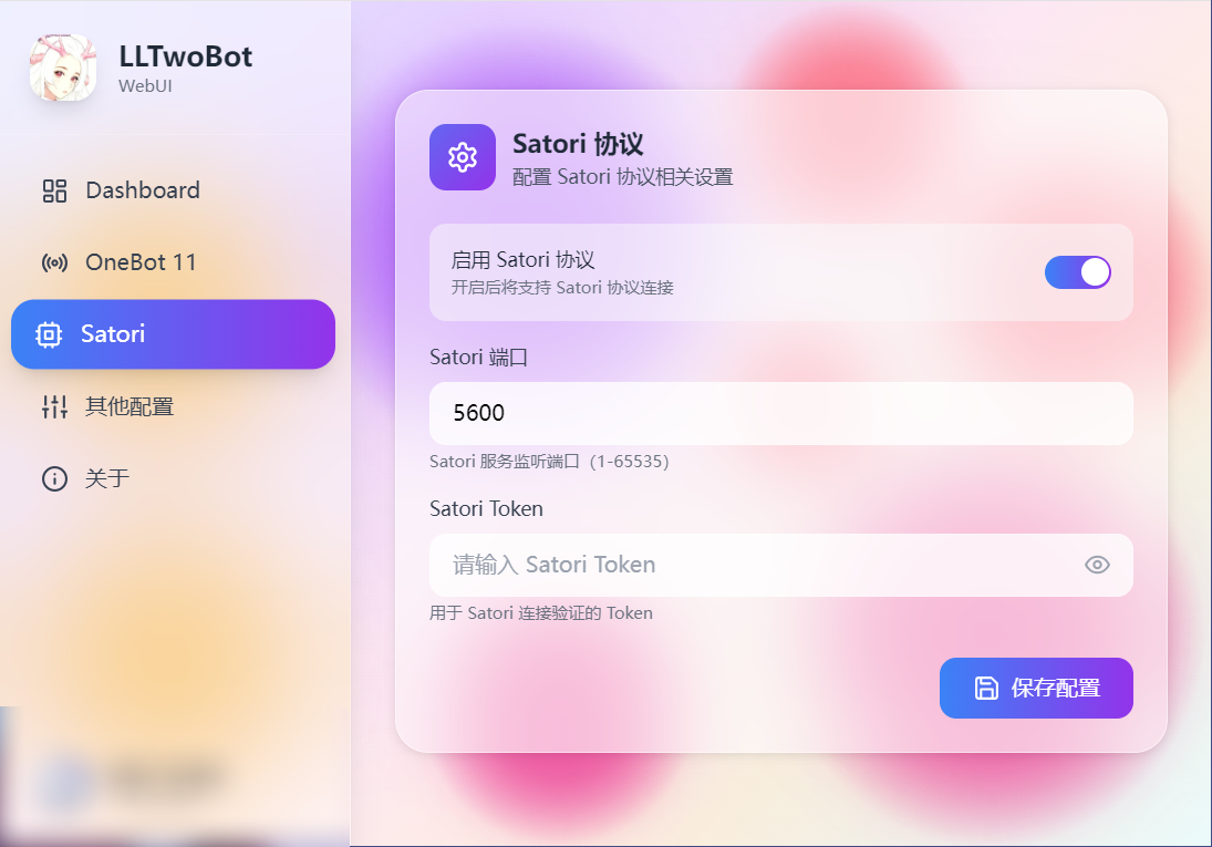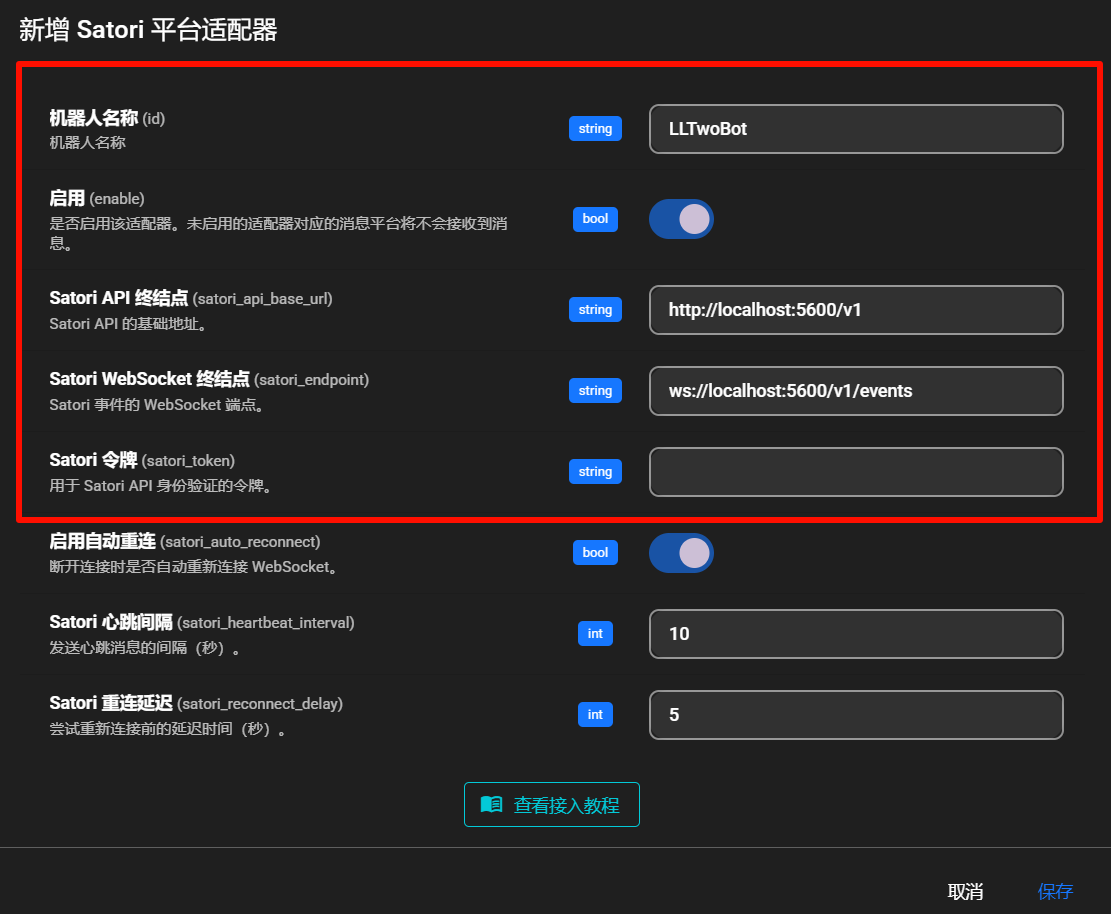 ws://localhost:5600/v1/events - Satori 令牌 (satori_token):根据 LLTwoBot 配置填写(如有设置)